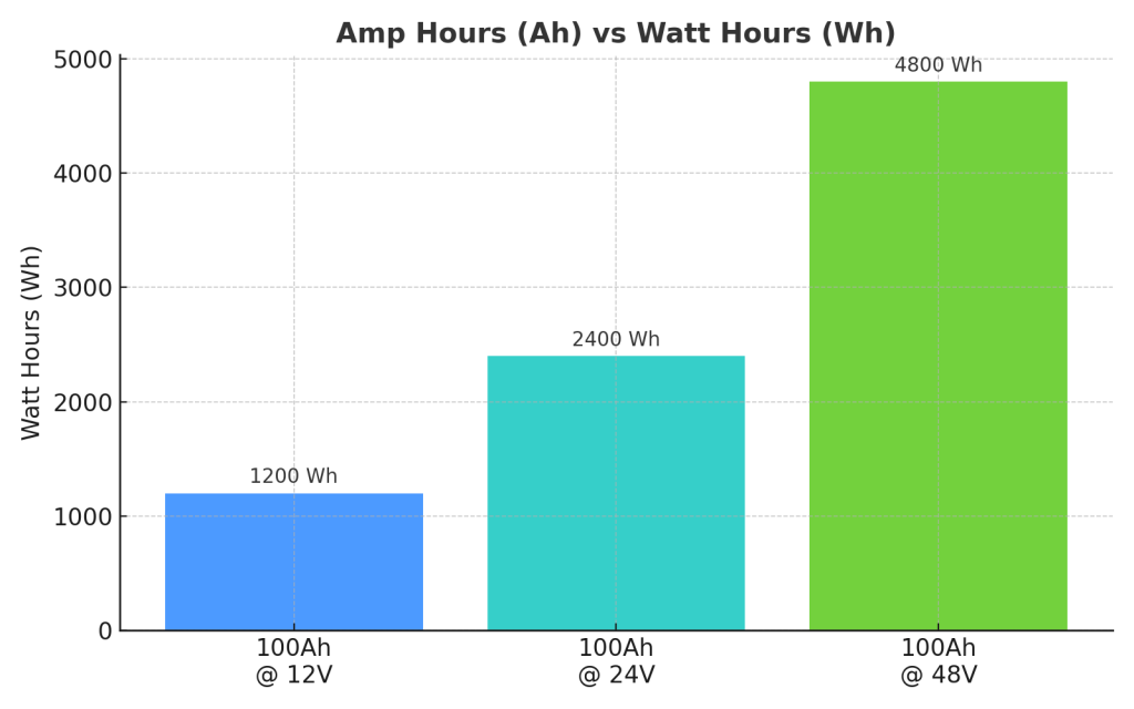 Watt Hours take into account both the capacity (Ah) and the voltage (V), giving a complete picture of how much usable energy a battery can provide.