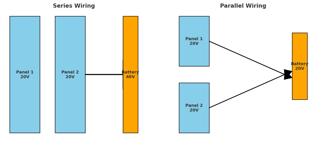 Panels can be wired in series (for higher voltage, lower current) or in parallel (better if shading is an issue).