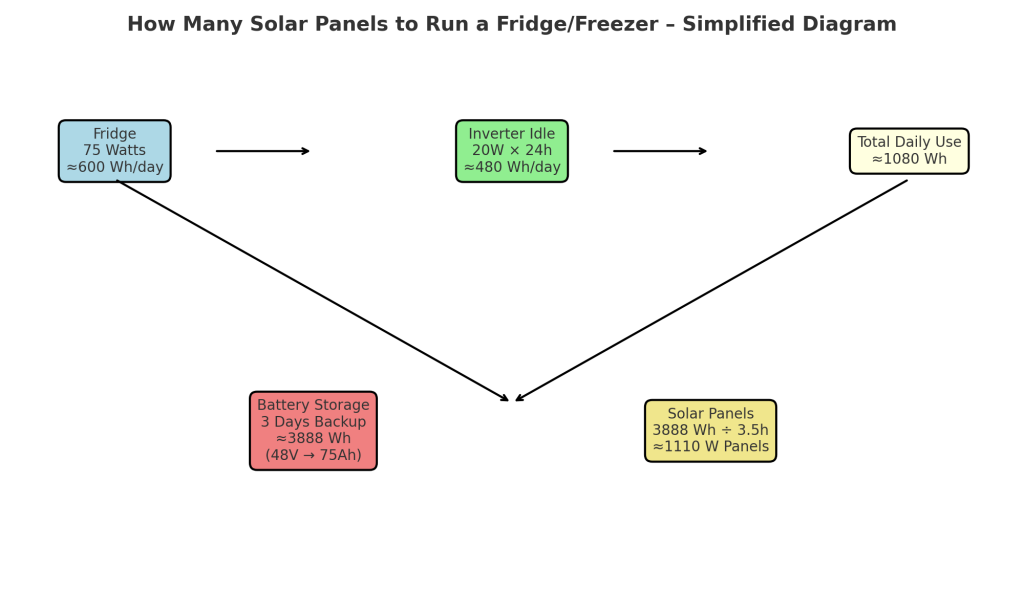 Running a refrigerator or freezer on solar power is absolutely practical when sized correctly. By factoring in fridge consumption, inverter losses, proper battery storage, and realistic solar hours, you can design a system that keeps your fridge running all year round.